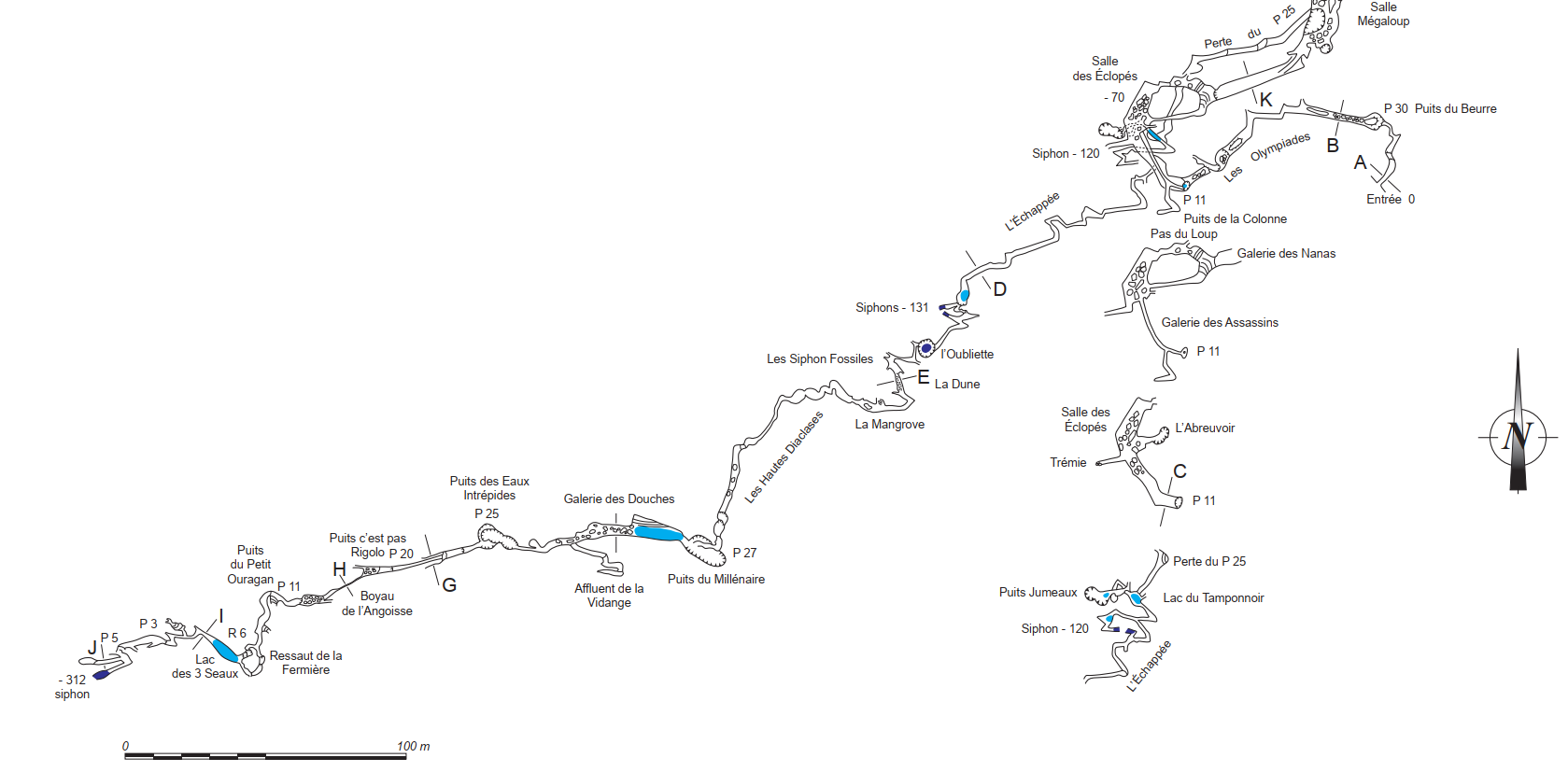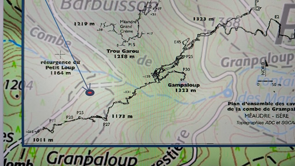 Le Julien est 130m plus haut que le Souffleur. Le point bas est l’Abbée, à -740m par rapport à l’entrée du Julien, on a environ 150m de montée, descente dans le boyau anal, puis on remonte à pied de 70m jusqu’à la base des puits du Souffleur et là, on a 550m de puits à remonter.